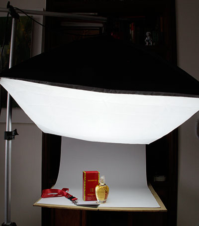La primera fotografía muestra la forma como se arma un set para fotos de productos sobre mesa, en donde la fuente de luz -en este caso una softlight o caja de luz de 50×70 cm– se coloca en forma cenital.
